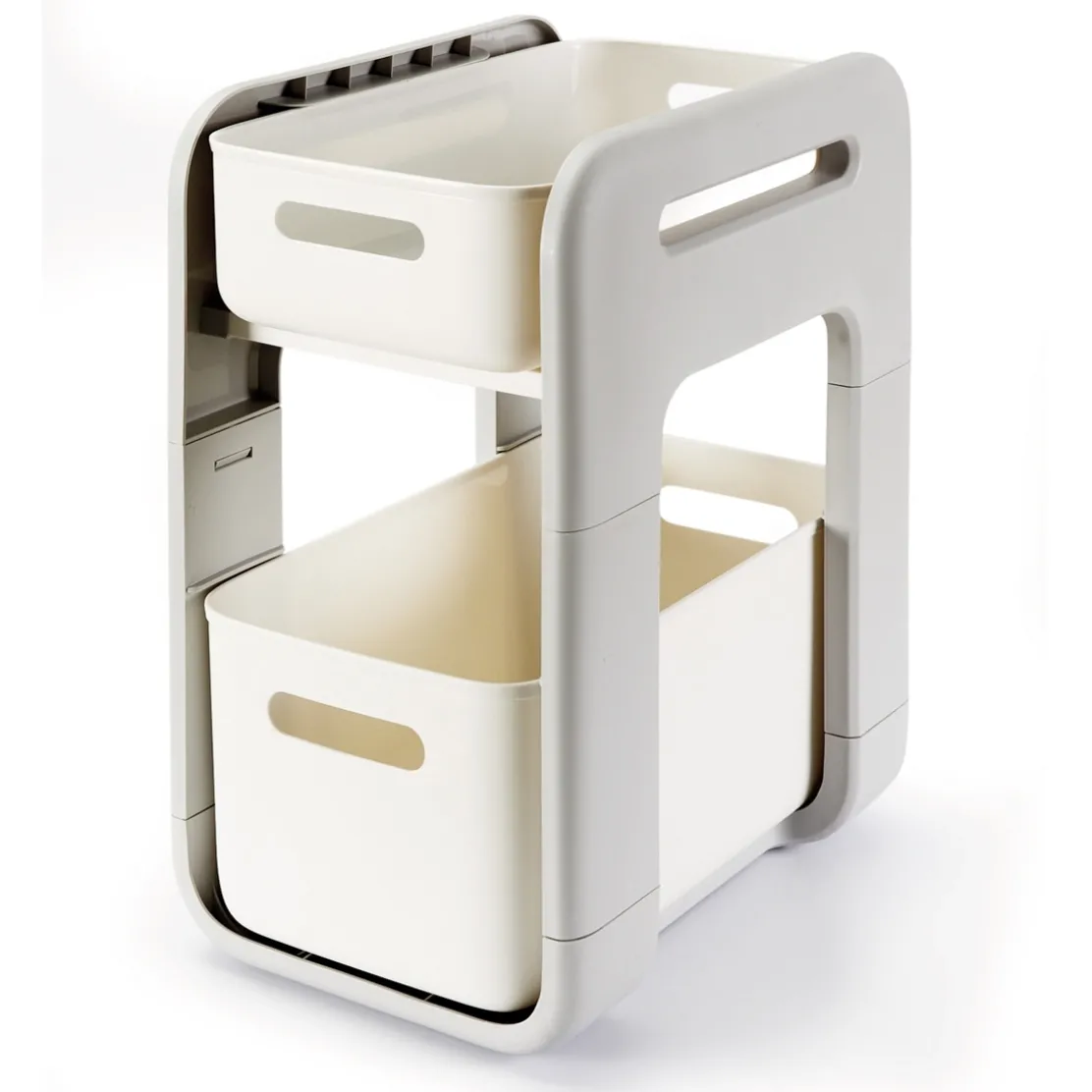 Cette étagère à deux étages, constituée de 2 paniers coulissants, est idéale pour organiser votre cuisine et avoir accès facilement aux produits rangés dedans, tout en économisant de la place. En matière plastique. Dim. 25,5 x 38,5 x 44,5 cm.