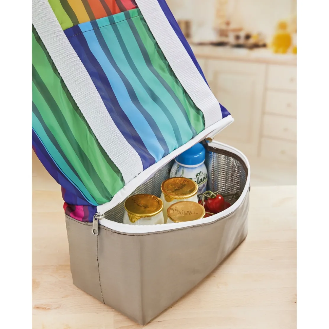 Sous un joli décor rayé ce sac assure aussi la bonne préservation des aliments : il intègre un double fond au revêtement isotherme qui conserve la fraîcheur et s’ouvre en grand par une double glissière. Le haut du cabas de belle contenance reçoit le reste de vos courses. 100% polyester. Dimensions : 28,5 x 10 x 45 cm.