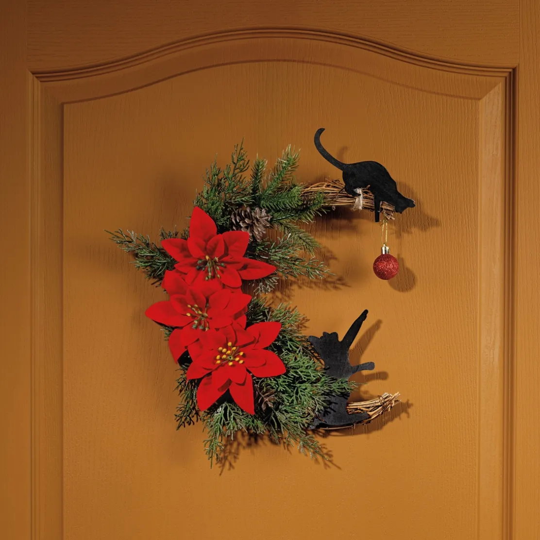 Sur une porte ou une fenêtre, accrochez cette magnifique couronne de bienvenue pour accueillir vos invités. Composée d’imitation de branches de sapin et de fleurs de poinsettias, d’une boule de Noël avec laquelle joue 2 petits chats. Livré avec un crochet adhésif. En bois, polyester et matière plastique. Dim. 30 x 30 x 6 cm.