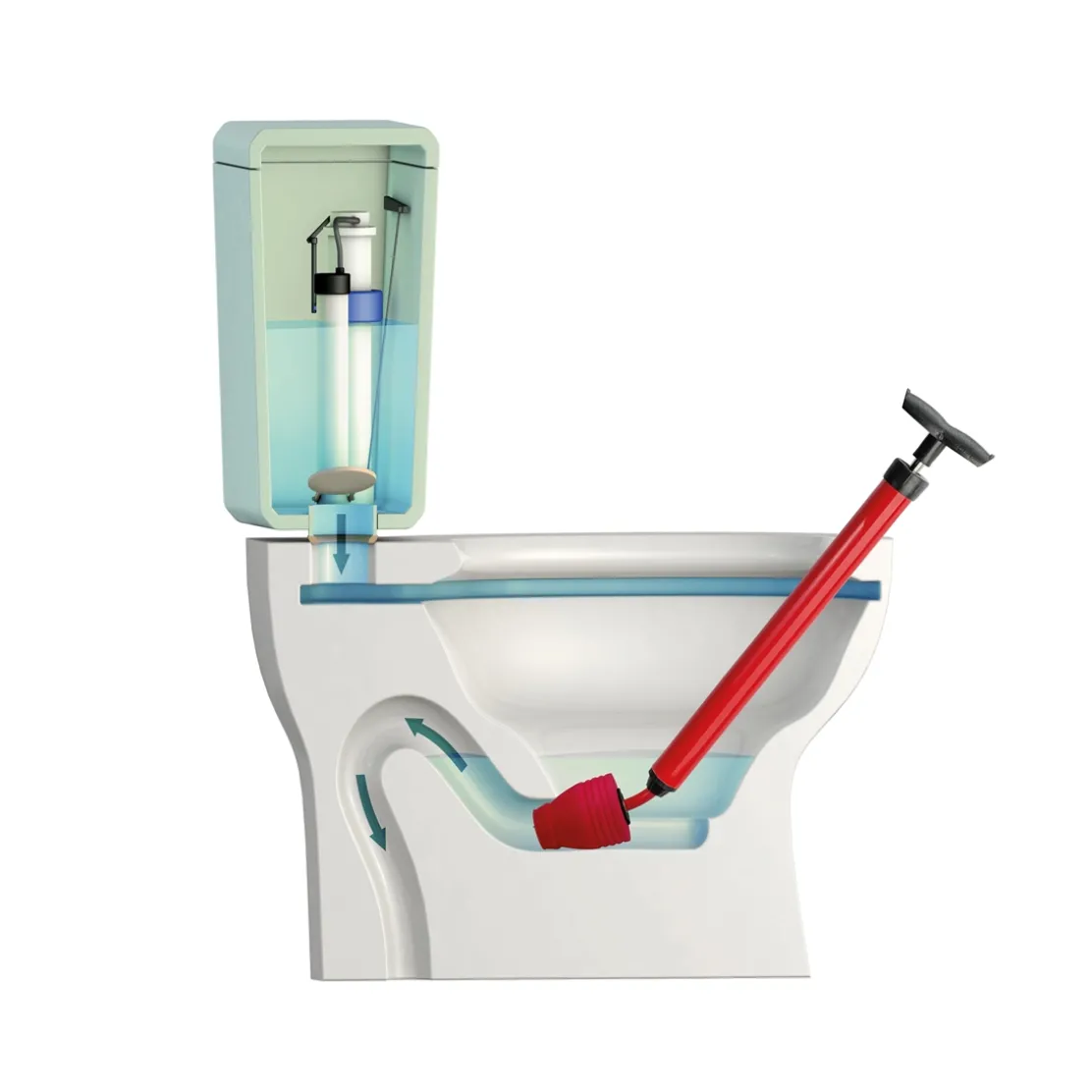 Facile, il suffit d’insérer l’embout souple au fond de la cuvette, de quelques coups de pompe et, sous l’effet de l’air comprimé, tous les corps solides sont inexorablement chassés.