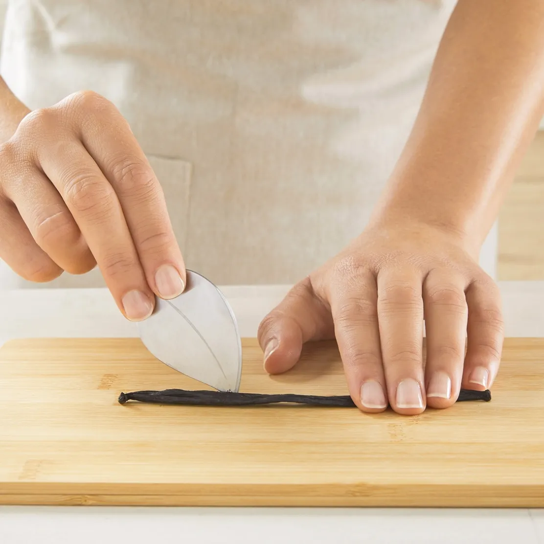 Facile à manier, cet ustensile de cuisine est doté d’un côté pointu pour fendre et égrainer la gousse et d’un côté arrondi pour récupérer la totalité des grains de vanille. Une opération sans danger et sans gâchis !