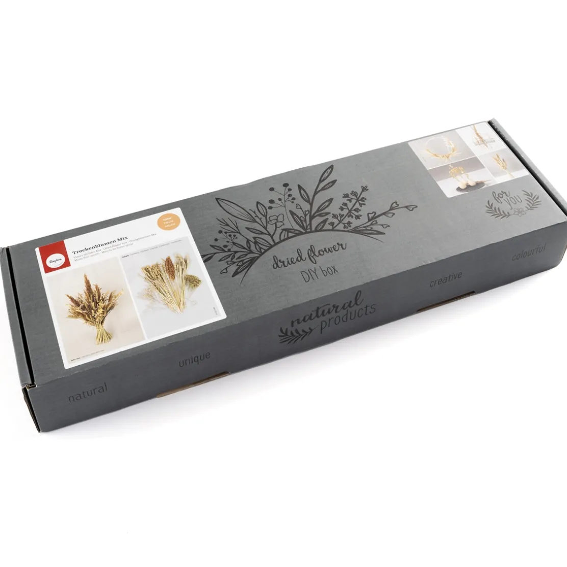 - – Chaque kit contient : des triticales (blé), des avenas (avoine), des triticum linium (petit épeautre), des reeds plume, des broom bloom, des statice tatarica (lavande de mer) et un cordon pour attacher les fleurs.