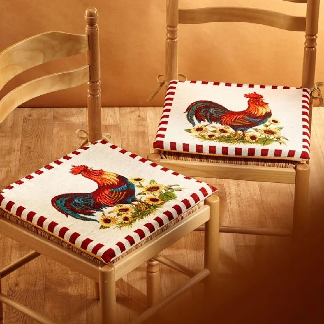 Déclinés sur des galettes bien épaisses qui rénovent joliment vos chaises, les coqs font des merveilles décoratives. Aussi, elles vous proposent une assise moelleuse et confortable. En 65% polyester, 35% coton ; rembourrage : 100% synthétique. Dimensions : 39 x 39 x 2,5 cm.