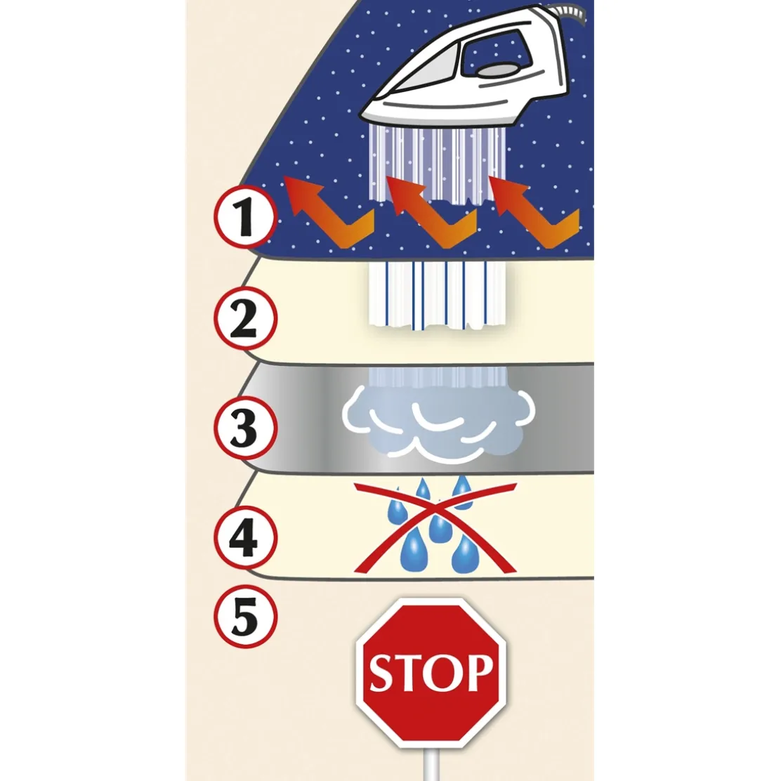 Le revêtement aluminium parfaitement étanche de cette nappe de repassage retient la vapeur et réfléchit en plus la chaleur transmise par le fer, permettant ainsi d’économiser jusqu’à 50% de votre temps de repassage. Molleton intégré pour un confort inégalable.