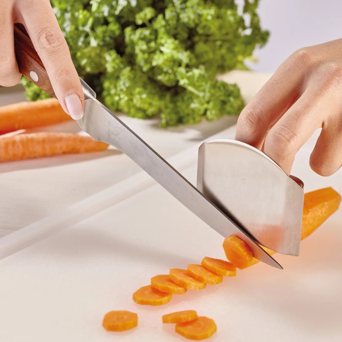 Lors de vos préparations culinaires, vous pourrez découper vos légumes, vos fruits ou votre viande en toute sécurité, en utilisant cette protection ! Simple d’utilisation, vos doigts sont protégés !