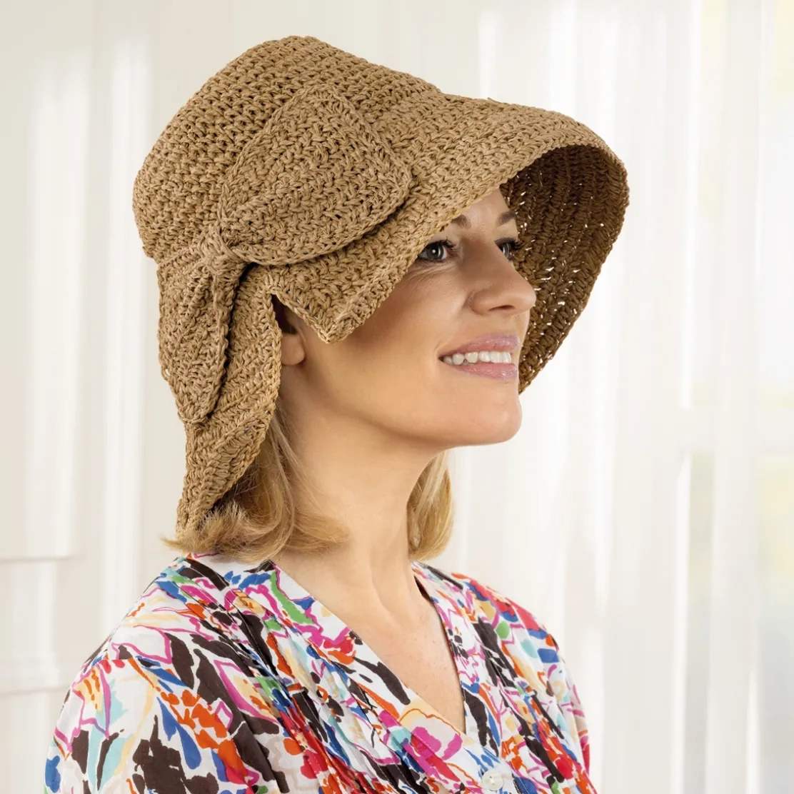 Une maille ajourée s’associe à un nœud sur le côté chapeau pour lui conférer un joli style à la fois chic et roglamour. La fente côté confère à ce chapeau, non seulement un certain raffinement mais aussi une belle aisance pour qu’il ne vous gêne jamais au porter.