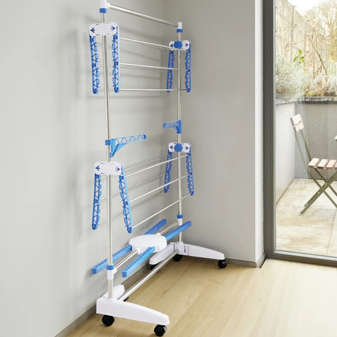 Il comporte 2 niveaux réglables, 4 grilles ajustables, des barres extensibles sur le côté pour accrocher les cintres, 32 crochets sur les côtés (pour pendre les chaussettes) et 6 roulettes. Pliable pour un rangement facile. Fonctionne sur secteur : 100-240 V, 50/60 Hz, 24 W. Conçu en acier inoxydable et matière plastique. Dim. plié : 88 x 14 x 142 cm, dim. déplié : 88 x 65 x 142 cm.