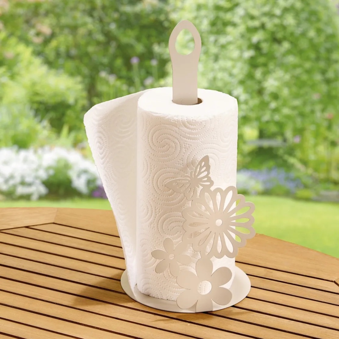 Ce ravissant support à essuie-tout, se pare d’une ornementation florale pleine de charme et de finesse. Sa structure stable assure un maintien parfait de votre rouleau, tout en facilitant son utilisation. En fer. Diam. 15 cm, haut. 33 cm.